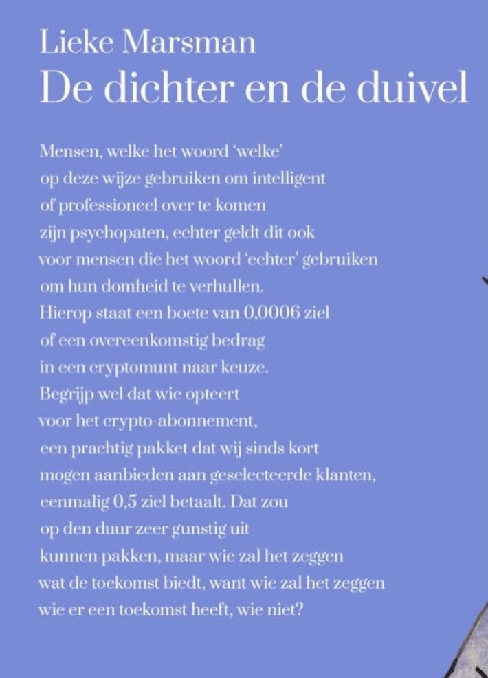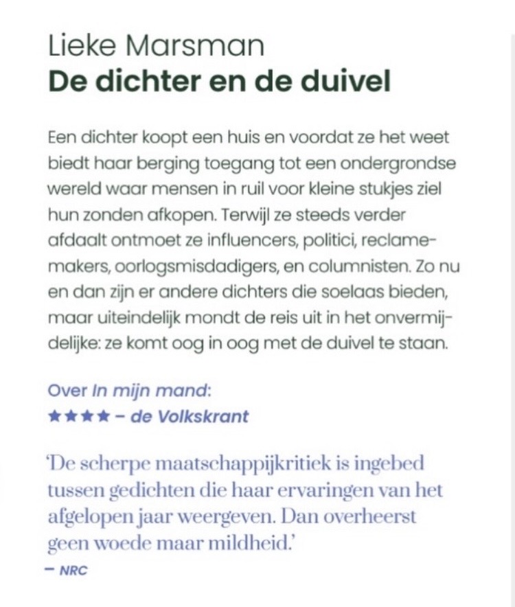 Lieke over de prijs: “Het ontroert mij ook dat mijn allereerste bundel bij de toekenning van deze prijs een rol speelt. “Er staan gedichten in die ik schreef toen ik 17 was – het idee dat die lieve schatten er nog steeds mogen zijn, raakt me.“